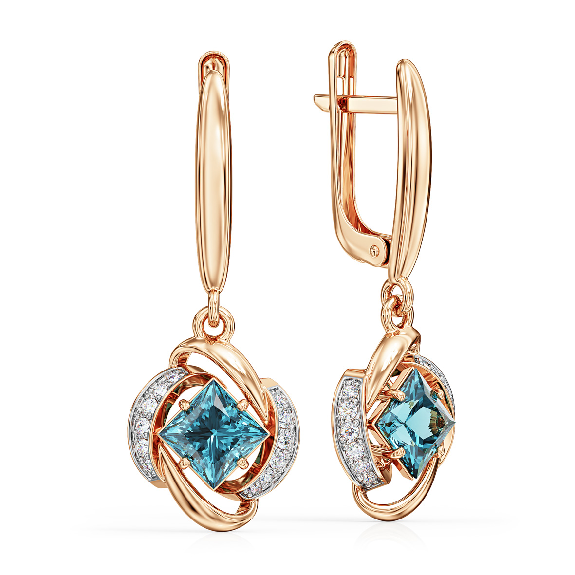 Gold earrings with blue topaz and cubic zirkonia. Article 441837