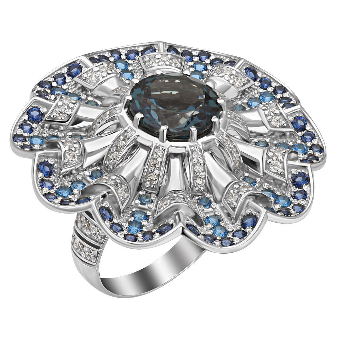 Каблучка в білому золоті з блакитними топазами і фіанітами. Артикул 371780В розмір 18