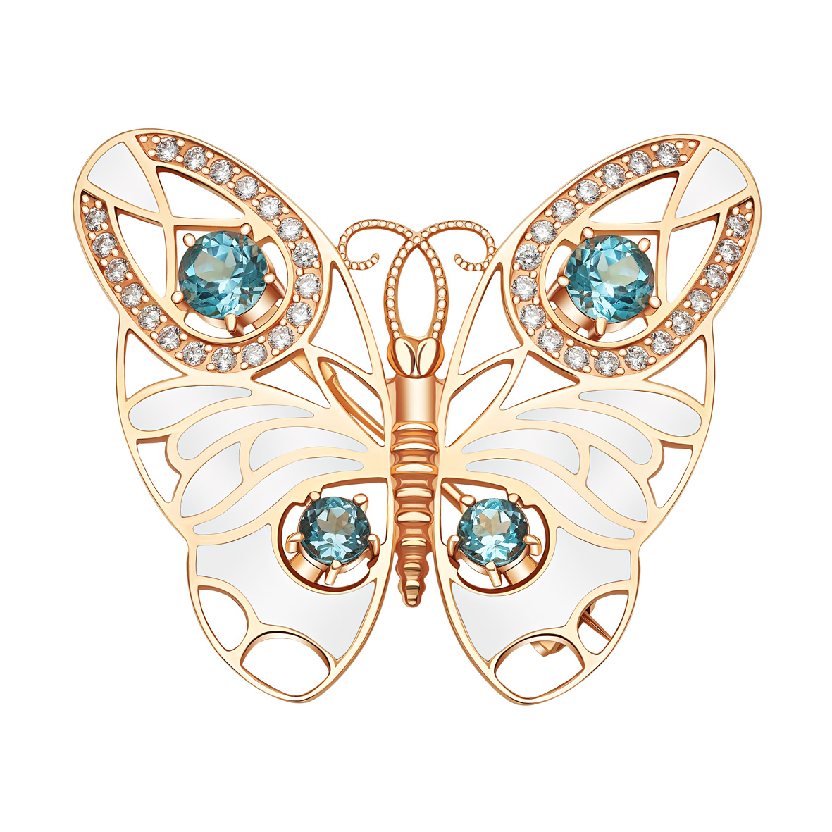 Золота брошка з блакитним топазом, фіанітами і емаллю. Артикул 671059Е