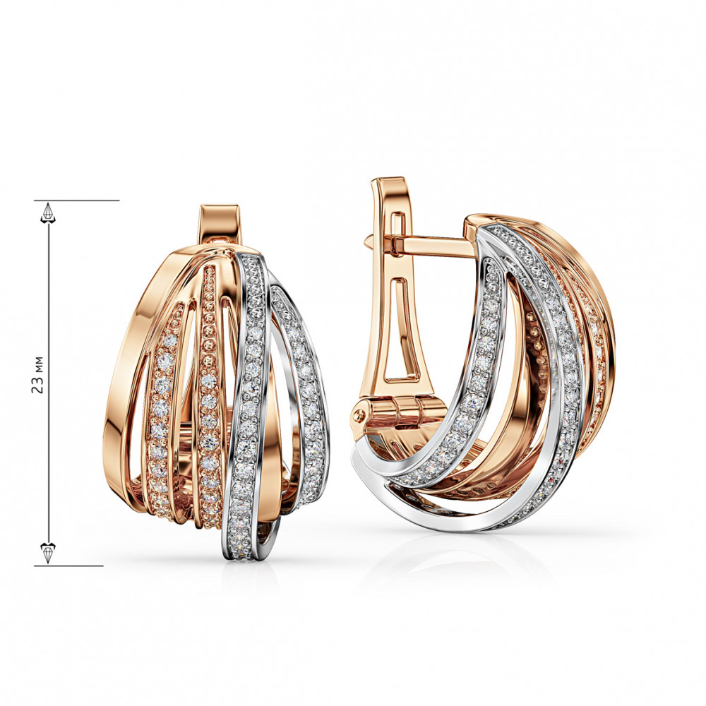 Золоті сережки з фіанітами — виразна прикраса, у якій класична форма переосмислена через призму сучасної пластики. Виріб створений з червоного золота 585 проби й побудований на контрасті вигнутих ліній і мерехтливого декору. Конструкція складається з кількох дугоподібних елементів, що ніби рухаються назустріч одне одному — цей ефект надає моделі відчуття легкості й об’ємного руху. Чергування гладких золотих ліній і доріжок, усипаних сяючими фіанітами, створює вишуканий світловий ритм. Камені акуратно інкрустовані в три з п’яти секцій, завдяки чому прикраса зберігає гармонію й не перевантажена деталями. Гармонійно виглядають у комплекті з каблучкою з колекції "У ритмі TANGO", утворюючи цілісний і незабутній дует.