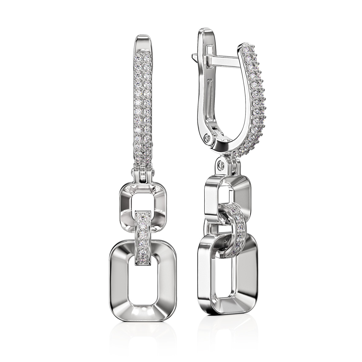 Вишукані золоті сережки з фіанітами із колекції "У ритмі TANGO" втілюють ідеальне поєднання елегантності та сучасного стилю. Виготовлені із білого золота 585 проби, вони сяють благородним блиском, що підкреслює їхній витончений характер. Аксесуари складаються з великих геометричних ланок, плавно переходячи одна в одну, створюючи відчуття гармонії та плавного руху. Фіаніти надають прикрасам додаткового блиску, підсилюючи елегантність дизайну. Їхні сяючі грані ніжно вловлюють світло, наповнюючи виріб розкішшю та витонченістю. Ці вироби чудово виглядають як самостійний акцент, привертаючи захоплені погляди своїм унікальним дизайном і сяючими фіанітами, але для ще більш ефектного образу вони ідеально поєднуються з каблучкою або браслетом.