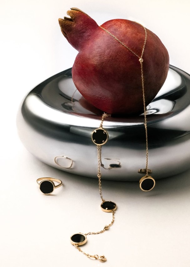 Золотий браслет з агатом – витончена прикраса, яка гармонійно поєднує простоту форм і розкішну елегантність. Виготовлений із червоного золота 585 проби, що надає йому теплий відтінок і підкреслює його благородність. Головним акцентом виробу є три круглі елементи, інкрустовані натуральним чорним агатом. Камінь із насиченим глибоким відтінком символізує внутрішню силу, захист і впевненість. Полірована поверхня агату гармонійно поєднується із золотою оправою, створюючи вишуканий контраст. У поєднанні з сережками та кольє з колекції "Конфетті" браслет стає частиною стильного комплекту, який додасть образу витонченості та грації.