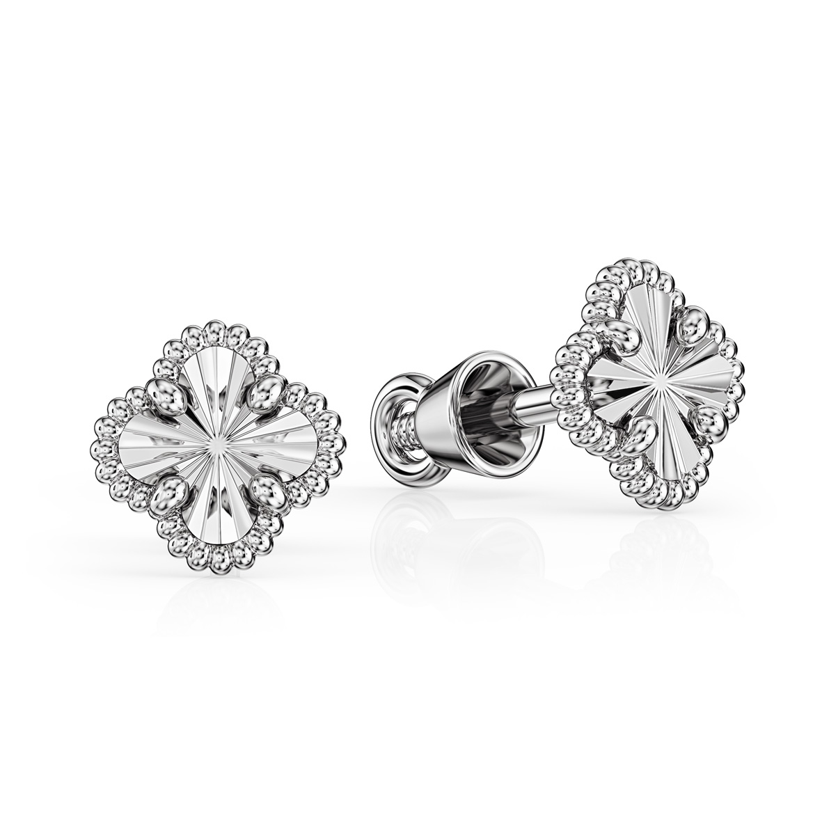 Золотые пуссеты из коллекции "В ритме TANGO" — выразительное украшение с ярко выраженной текстурой и декоративной симметрией. Модель выполнена из белого золота 585 пробы и оформлена в виде стилизованного четырехлепесткового мотива, вдохновленного архитектурными элементами и орнаментами эпохи барокко. Центральная часть украшена лучевыми насечками, которые создают эффект внутреннего сияния при попадании света. Контур изделия акцентирован объемной каймой из гладких и гранулированных золотых шариков, придающих серьгам легкий рельеф и визуальную насыщенность. Эти серьги станут идеальным решением для тех, кто ищет универсальное, но при этом эффектное украшение. Они гармонично сочетаются с подвеской или кольцом из той же коллекции.
