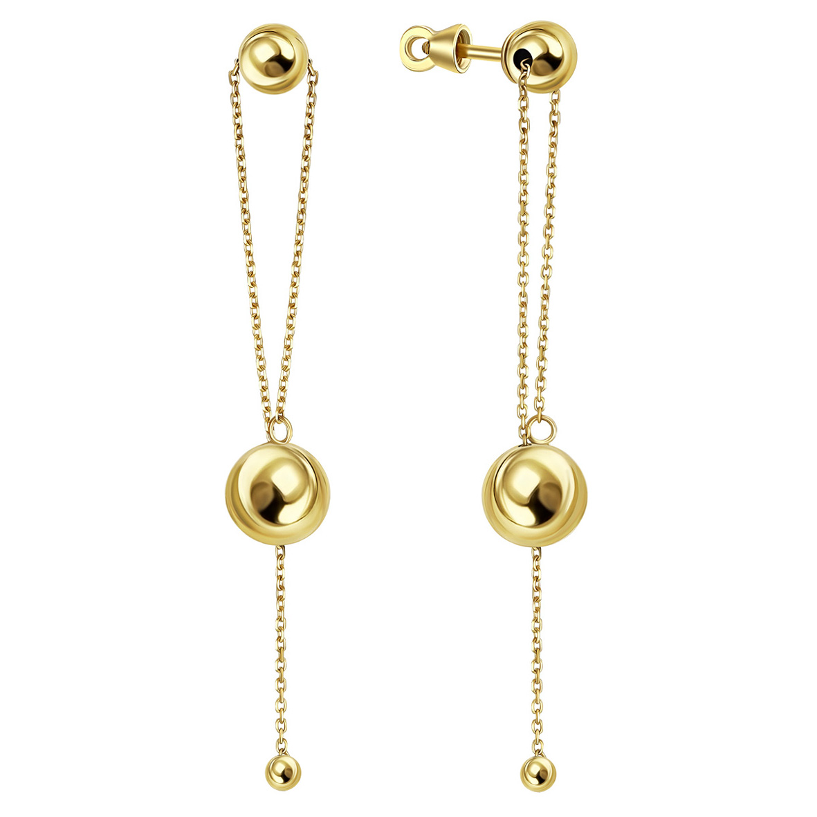 Золотые пуссеты из коллекции "Солнечная мозаика"— лаконичное и стильное украшение, в котором геометрическая точность сочетается с подвижной элегантностью. Модель выполнена из лимоного золота 585 пробы и оформлена в виде гладкой, зеркально отполированной золотой сферы, которая становится акцентной точкой композиции. От нее вниз и вверх отходят тонкие цепочки, создающие эффект вертикального движения и легкой визуальной игры. Нижняя часть украшена миниатюрной круглой деталью с насечками, добавляющей текстурный акцент. Такое оформление не только подчеркивает живость дизайна, но и делает серьги особенно выразительными в движении. Благодаря оригинальной конструкции и симметрии, пуссеты прекрасно подходят как для повседневных образов, так и для вечернего выхода, сочетаясь с кольцами или подвесками в современном стиле.