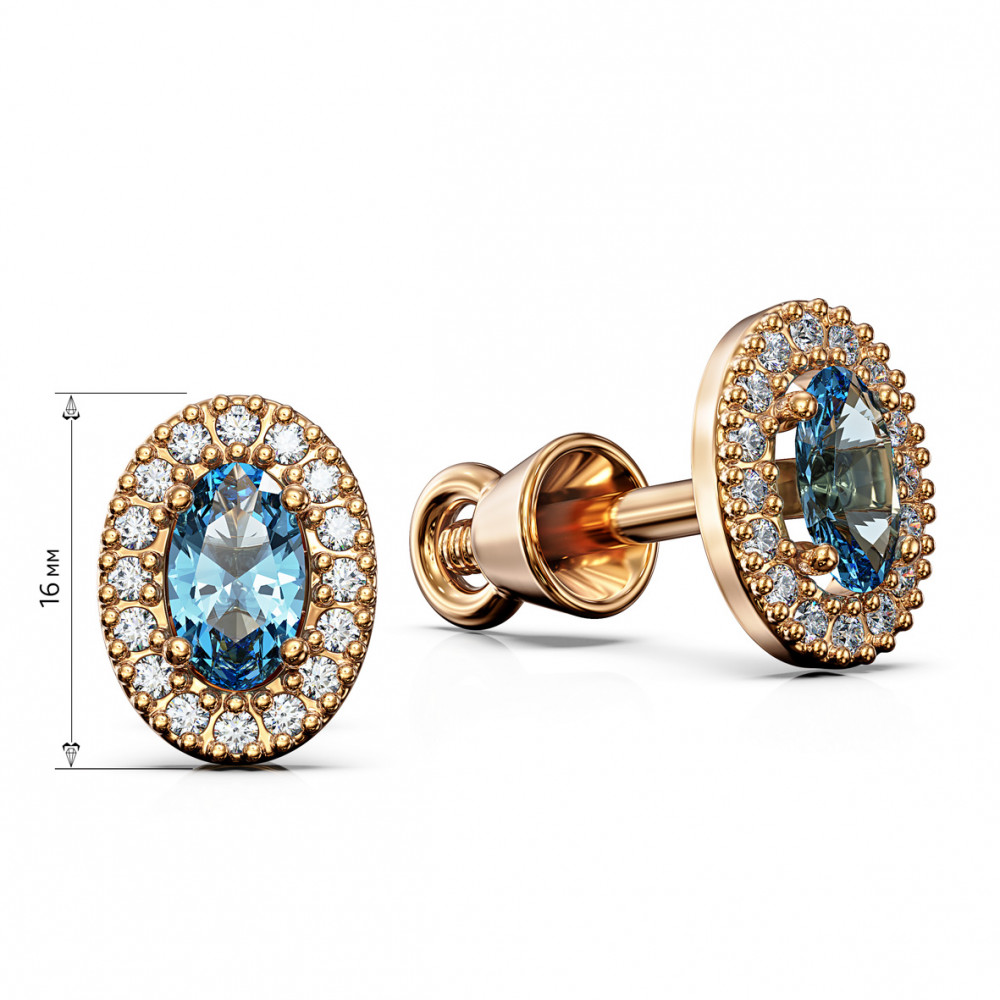 Золотые пуссеты с с голубым топазом и фианитами. Артикул 571152
